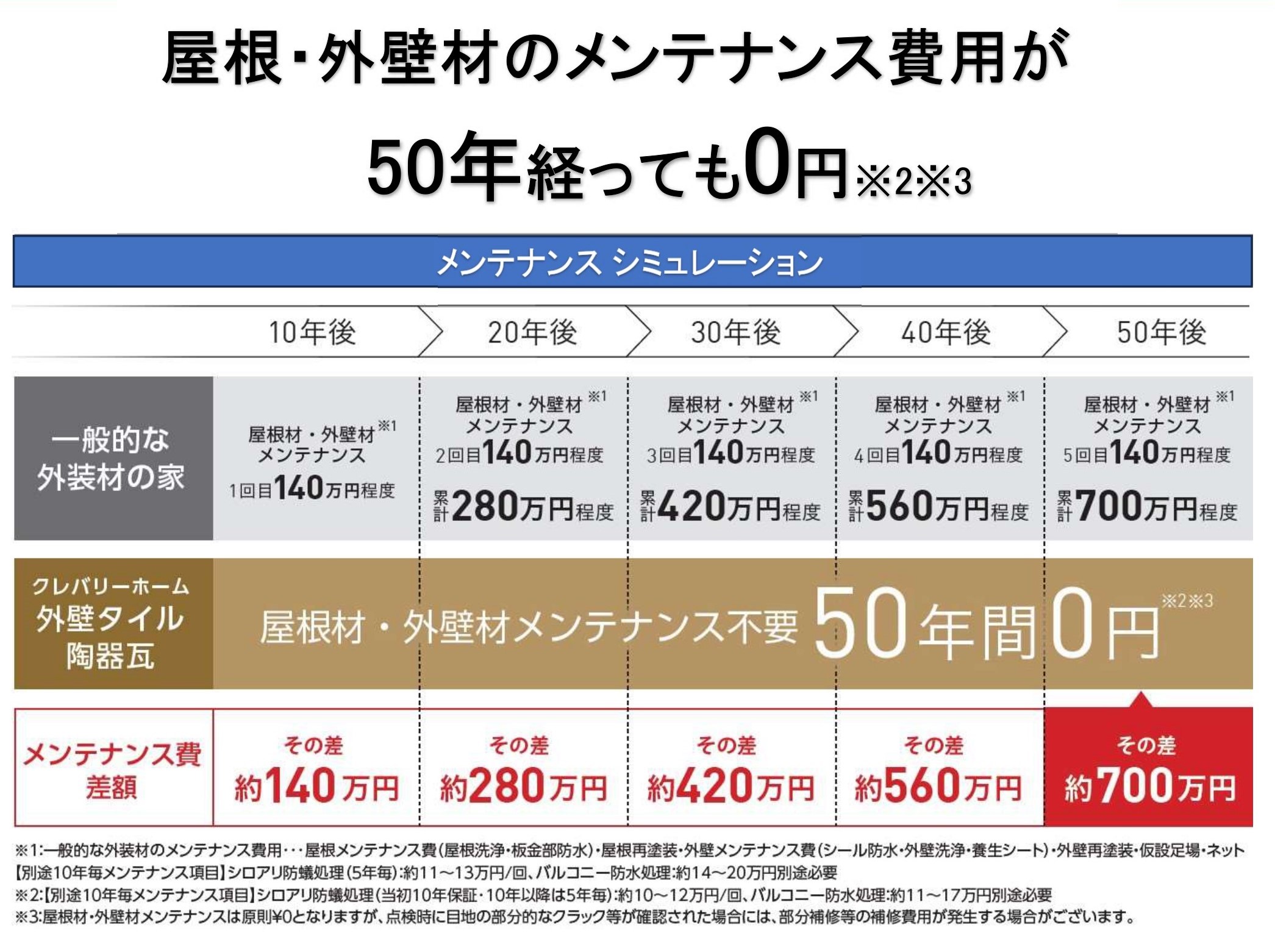 それに対し、外壁タイルのメンテナンス費用は0円。50年後にはその差が約700万円に。長期的に見ても外壁タイルのメンテナンスはかなり低コストに抑えられるといえるでしょう。