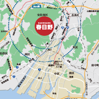 広島市の中心・紙屋町へ直線距離で5kmの恵まれたポジションに、21世紀最大規模の街『春日野』があります。