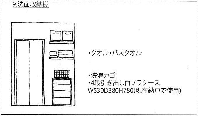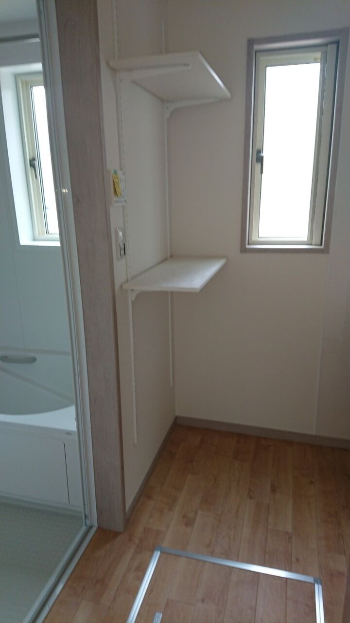 洗面化粧台の背面のスペースを利用して可動棚を設け、