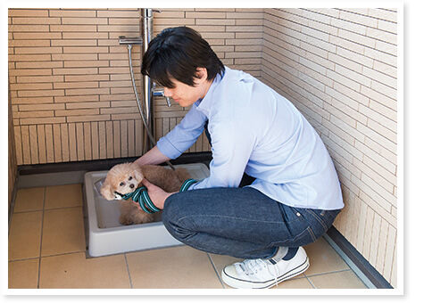 外から帰って、サッとワンちゃんの足や体を洗える外水栓。お湯も出るので、冬場でも安心して洗ってあげられます。
