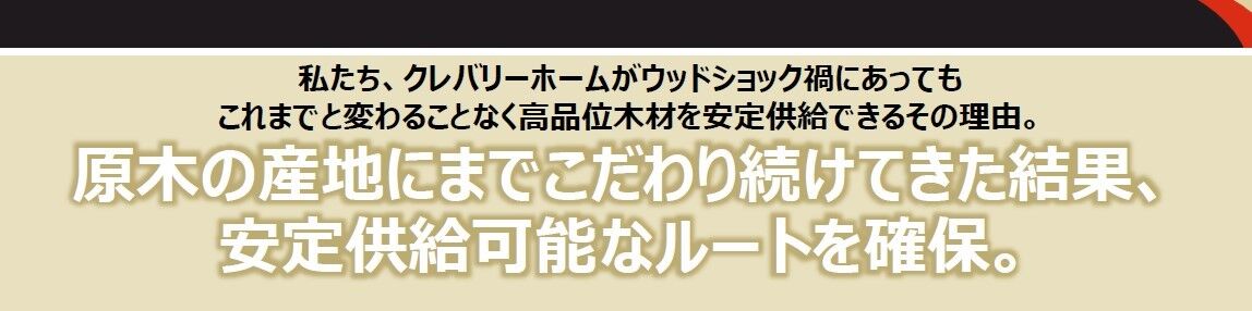 このように、 20 年以上に わたって構築してきた 国内・外の各パートナー企業様との 《 信頼関係 》こそが 、 今般の第三次ウッドショックにあっても 、これまでと変わることなく木材の 安定 供給を実現 することができている最大の 理由 であり 、そしてクレバリーホームの 「 誇り 」 でもあるのです 。