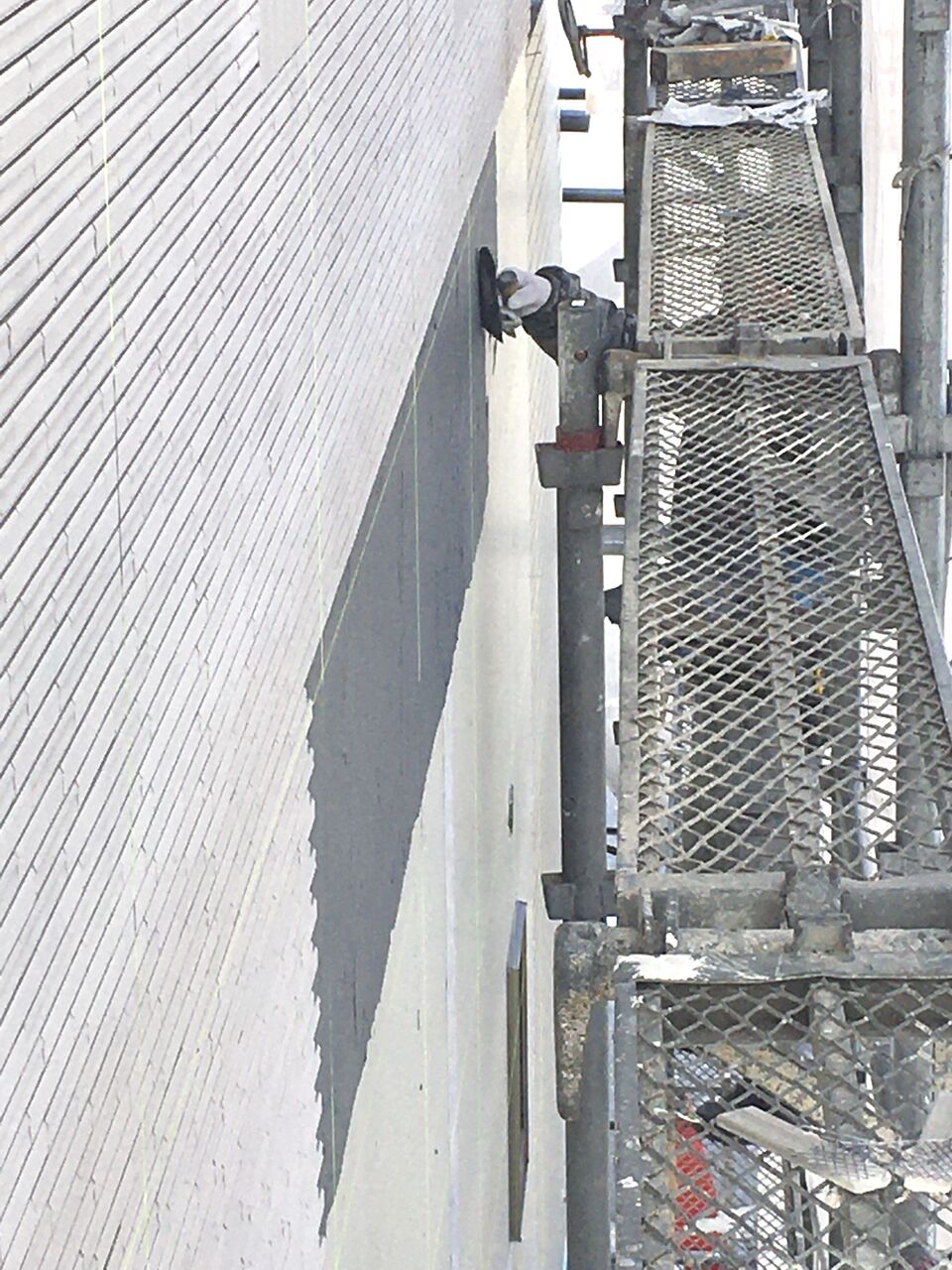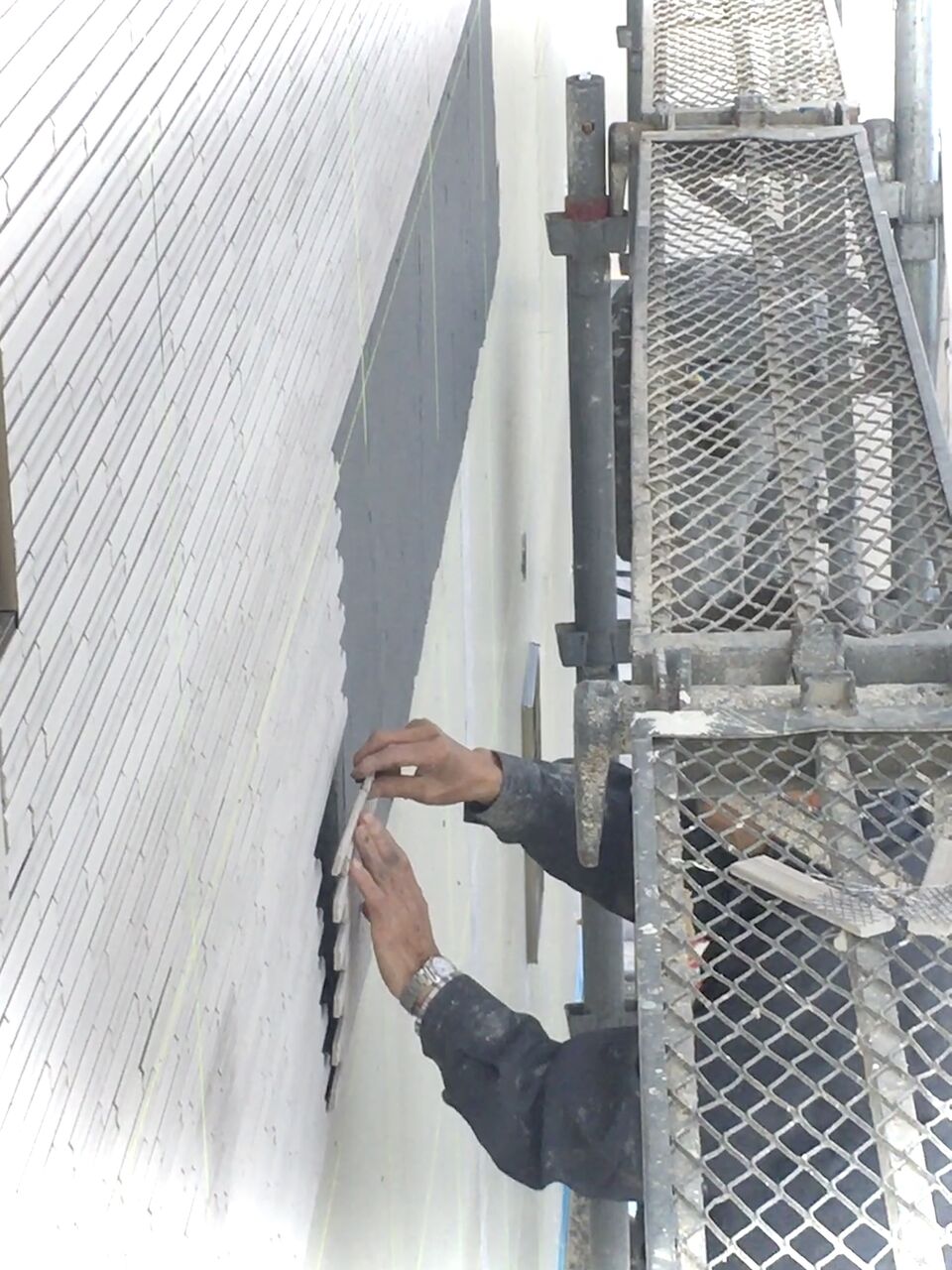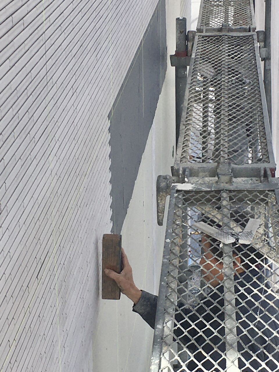 ブチルテープに使われるブチルゴムは、合成ゴムの一種で、気密性、防振性、防音性、電気絶縁性、耐薬品性などに優れ、様々な用途で使われています。充分なつなぎ目の保護をした上で、その上にタイルを貼るのです。下の写真はタイル外装専用の接着剤を塗布しています。