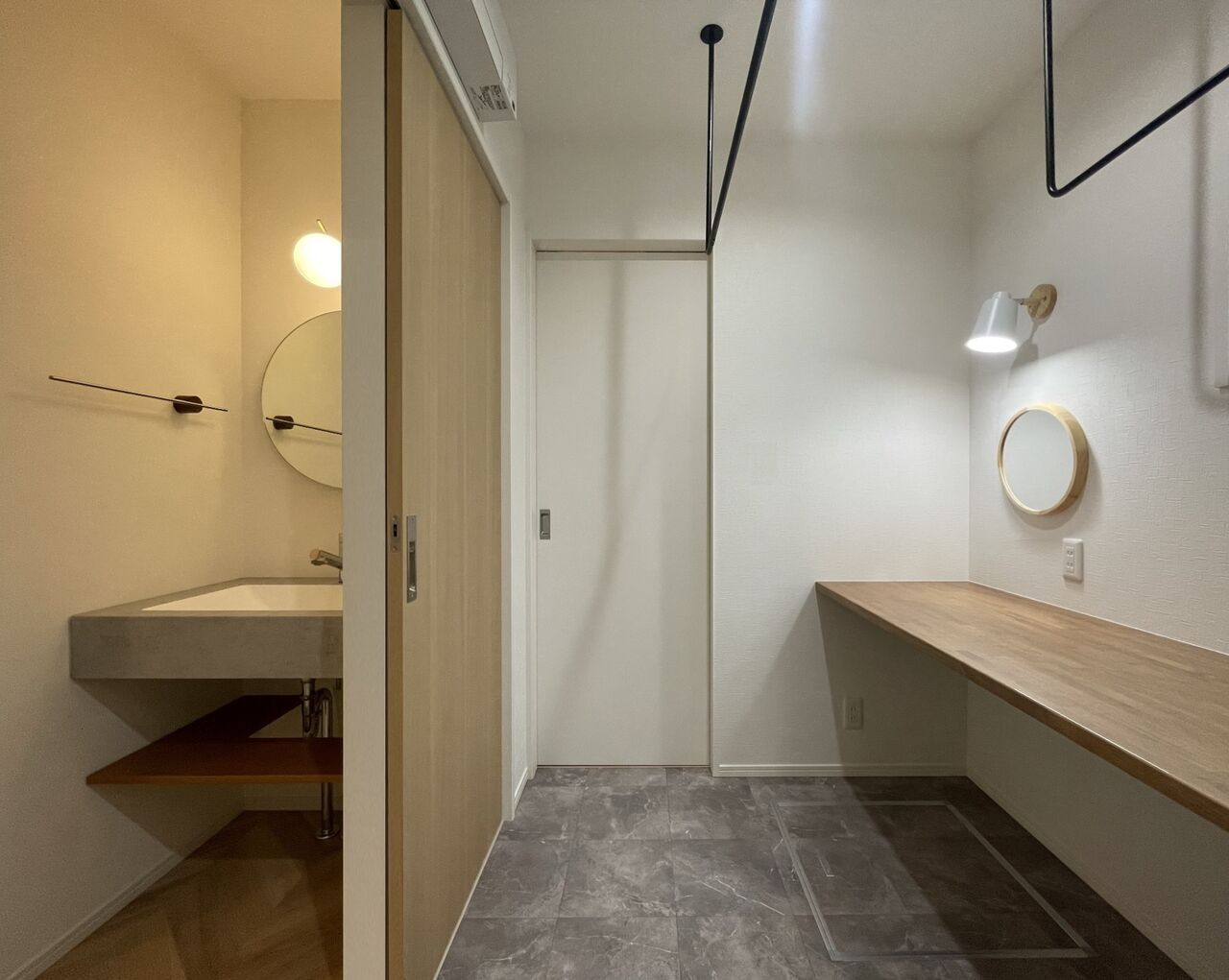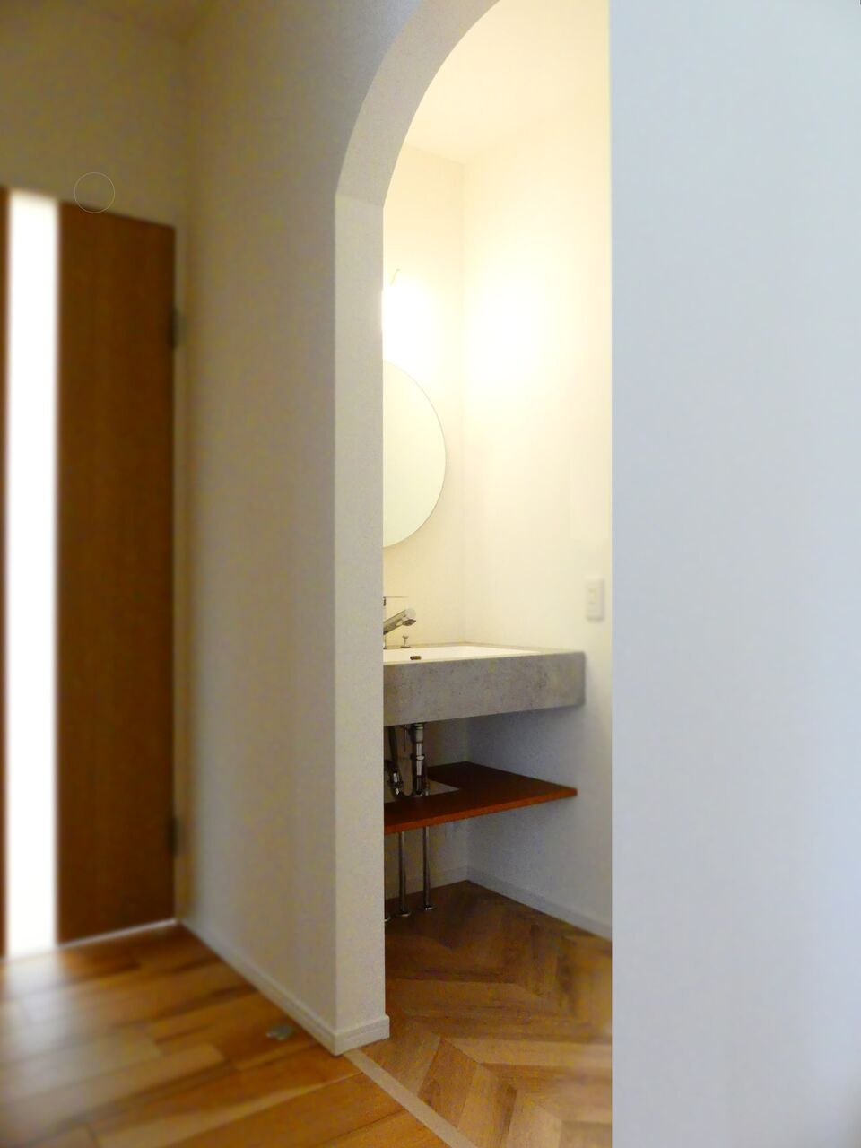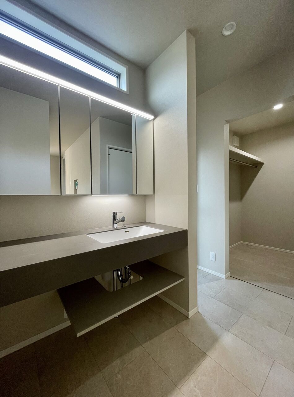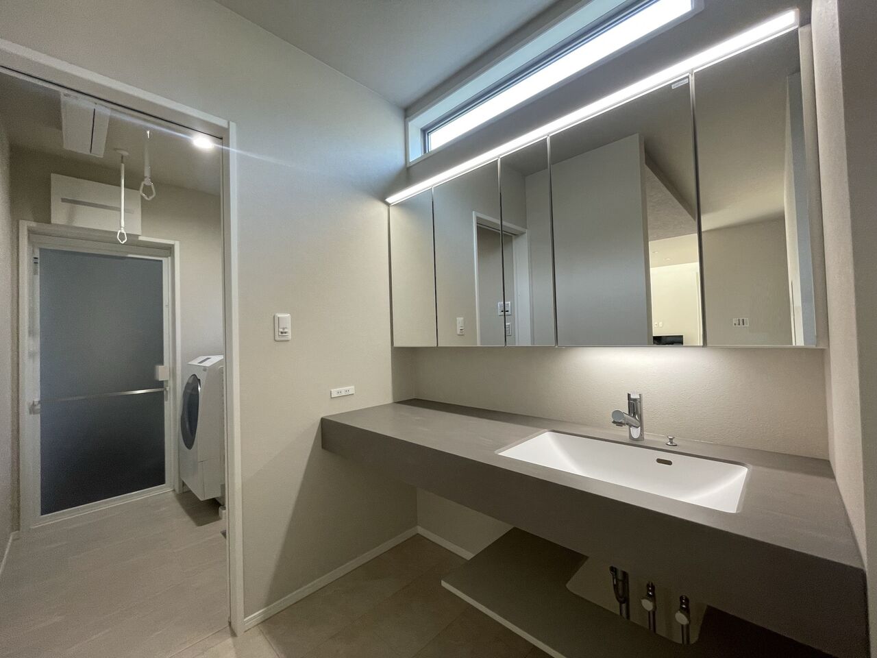 洗濯機置き場と脱衣室、洗面所を独立させ、誰かが入浴していても気兼ねなく手洗いができるようになっています。洗面所単体なので、すっきりしたホテルライクなデザインもつくりやすいですね。